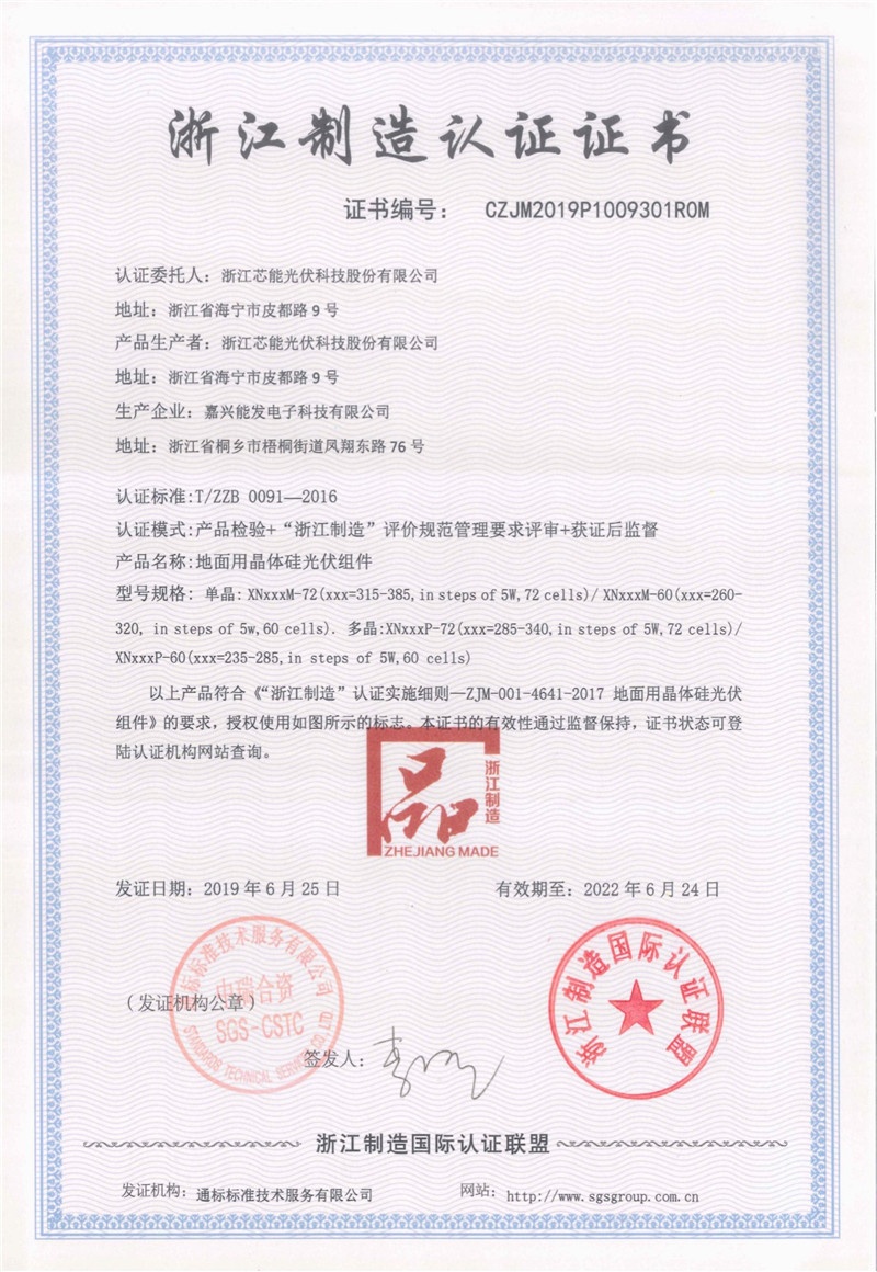 為進一步提升我司組件品牌競爭力,公司于2018年開始籌劃加盟“浙江制造”,在公司領(lǐng)導的支持下,經(jīng)過我司各職能部門近一年的辛勤勞動和密切配合,公司于2019年6月5日,順利通過“浙江制造”現(xiàn)場審核,于2019年6月25日獲得“浙江制造”認證證書。
